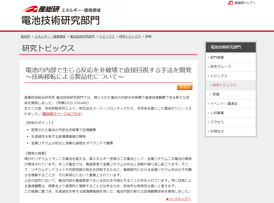 国立研究開発法人産業技術総合研究所 関西センター 電池技術研究部門の研究紹介トピックに、