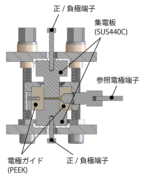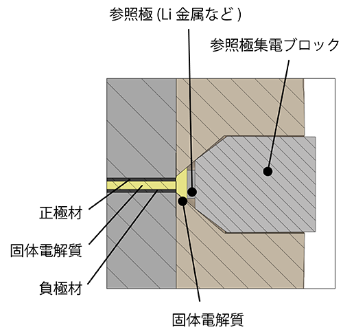正極と負極を分離した電位測定が可能な全固体3極セルです。