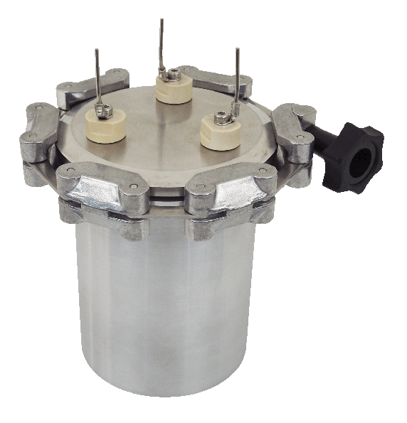 14286 | 材質:SUS304/316/440C,PEEK,PTFE 電極サイズ:直径 10mm 最大加圧圧力:300MPa ※約2.3ton 締付方法:トルクレンチにより4箇所 M6ナット締付 ※締付圧力約100~150MPa 耐熱温度:~150℃ セル寸法:直径 58mm×75mmH 重量:約460g |