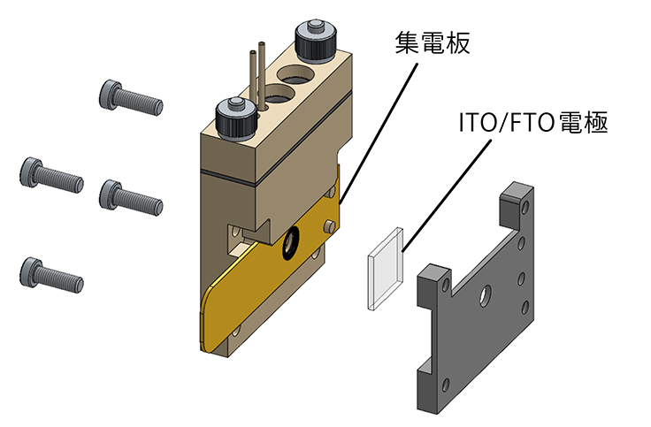 ITO電極は集電板と一緒に固定するだけで、電極面の外周360°から電気的なコンタクトが取れる構造です。また、反応面積は直径5.5mmに規定されます。